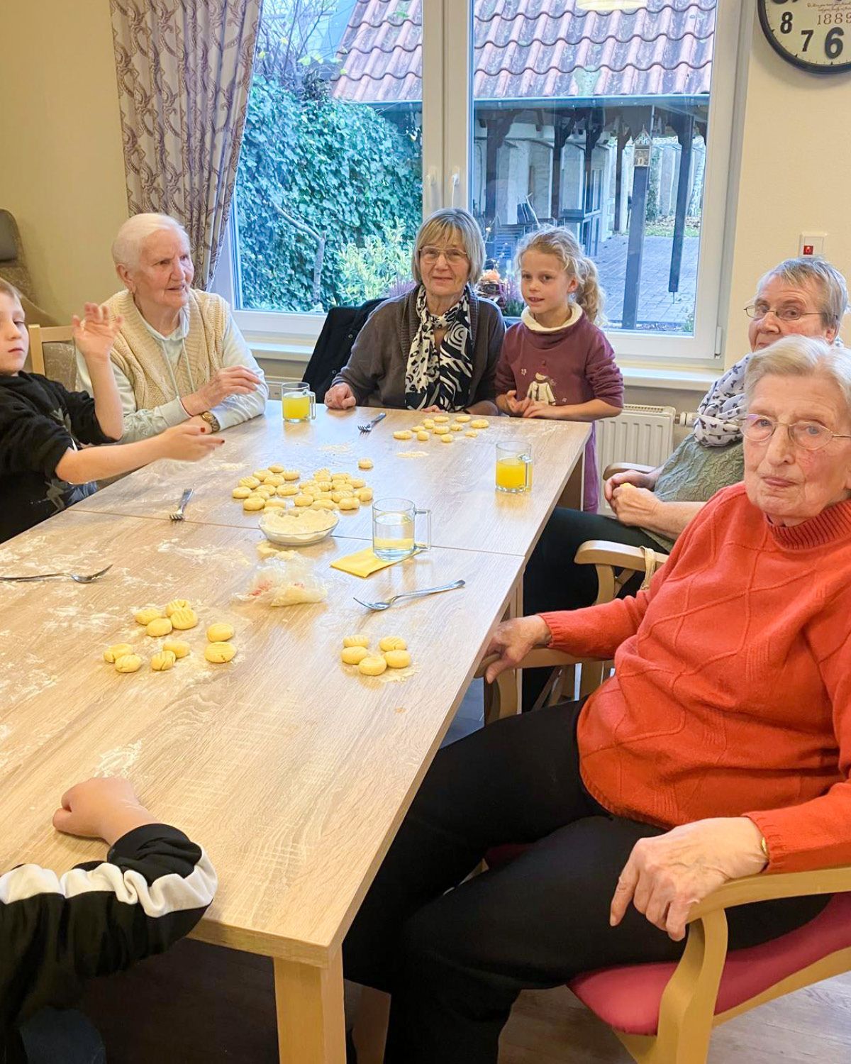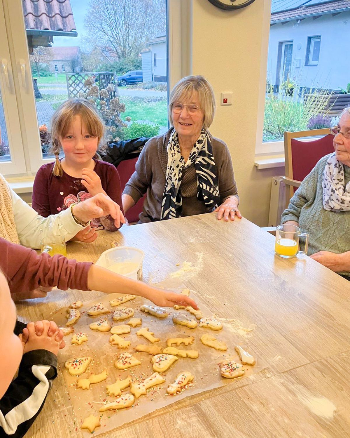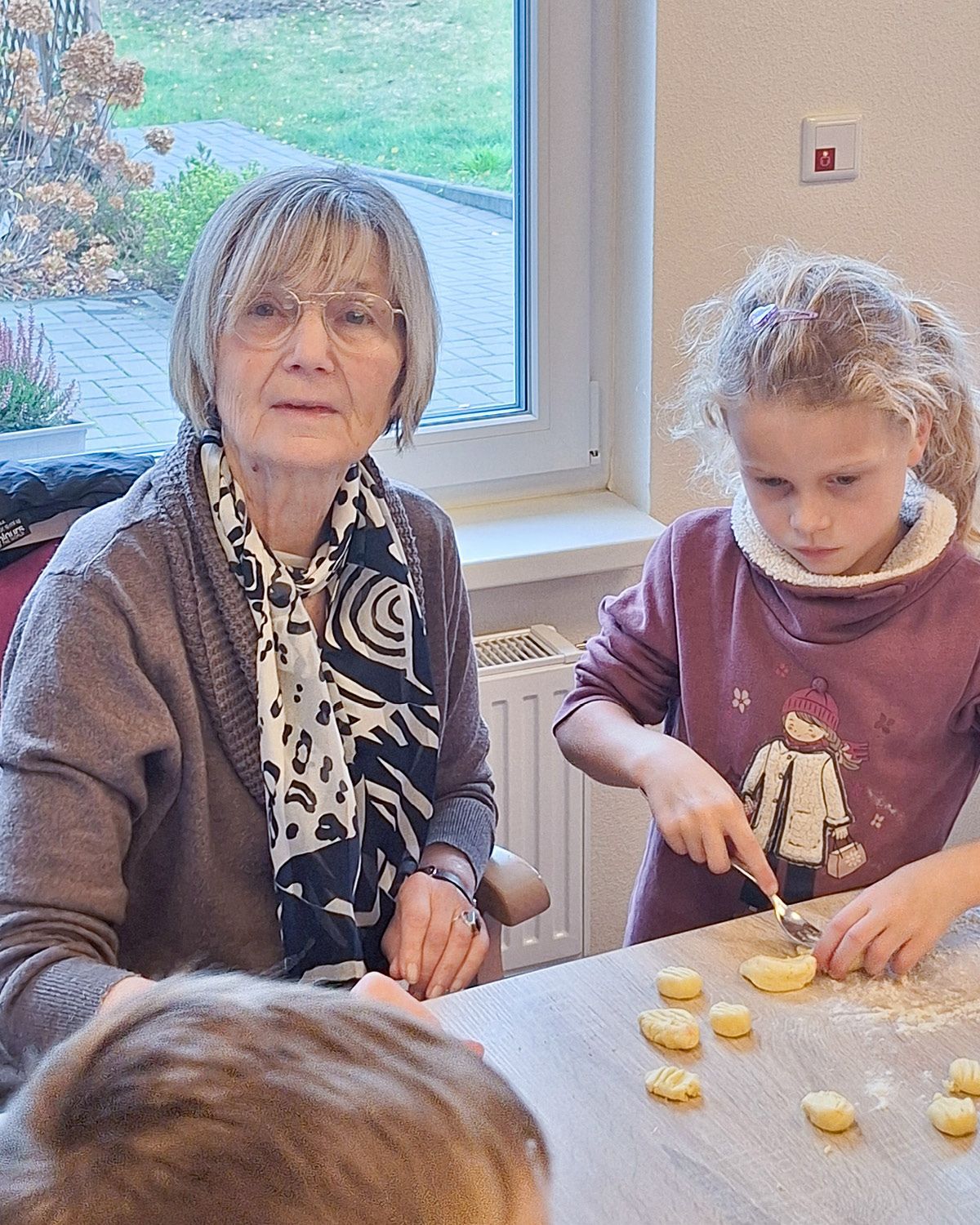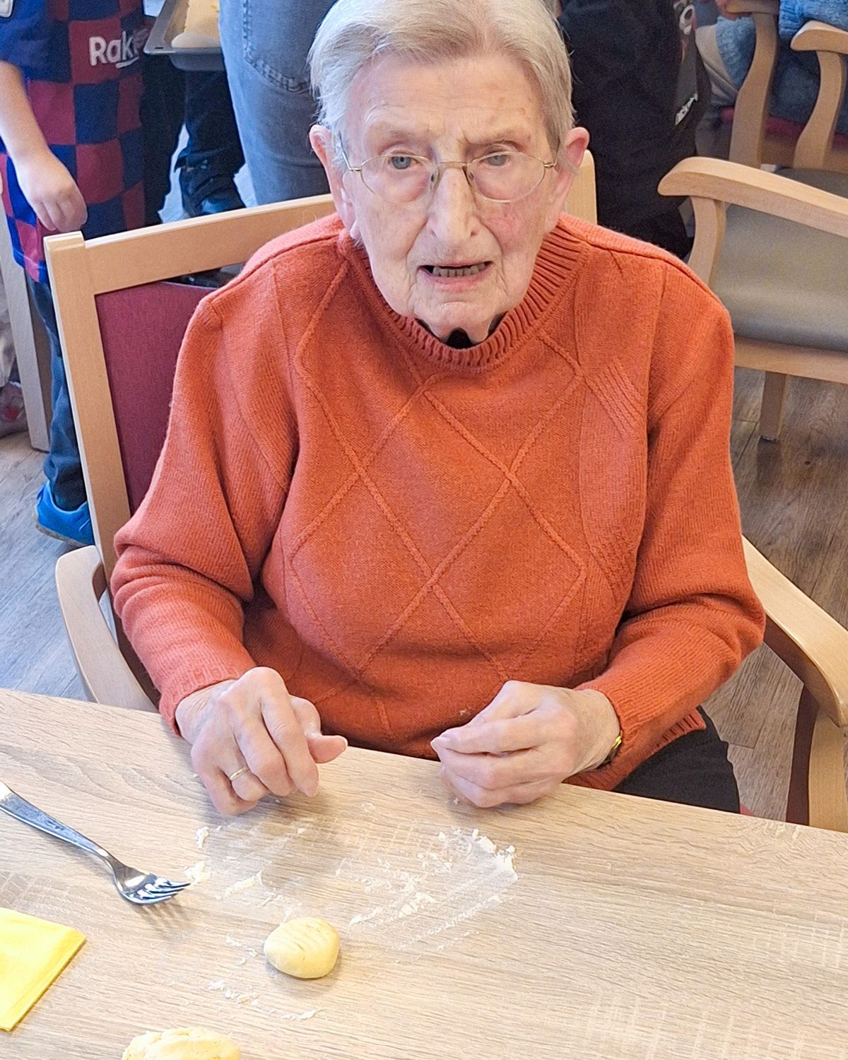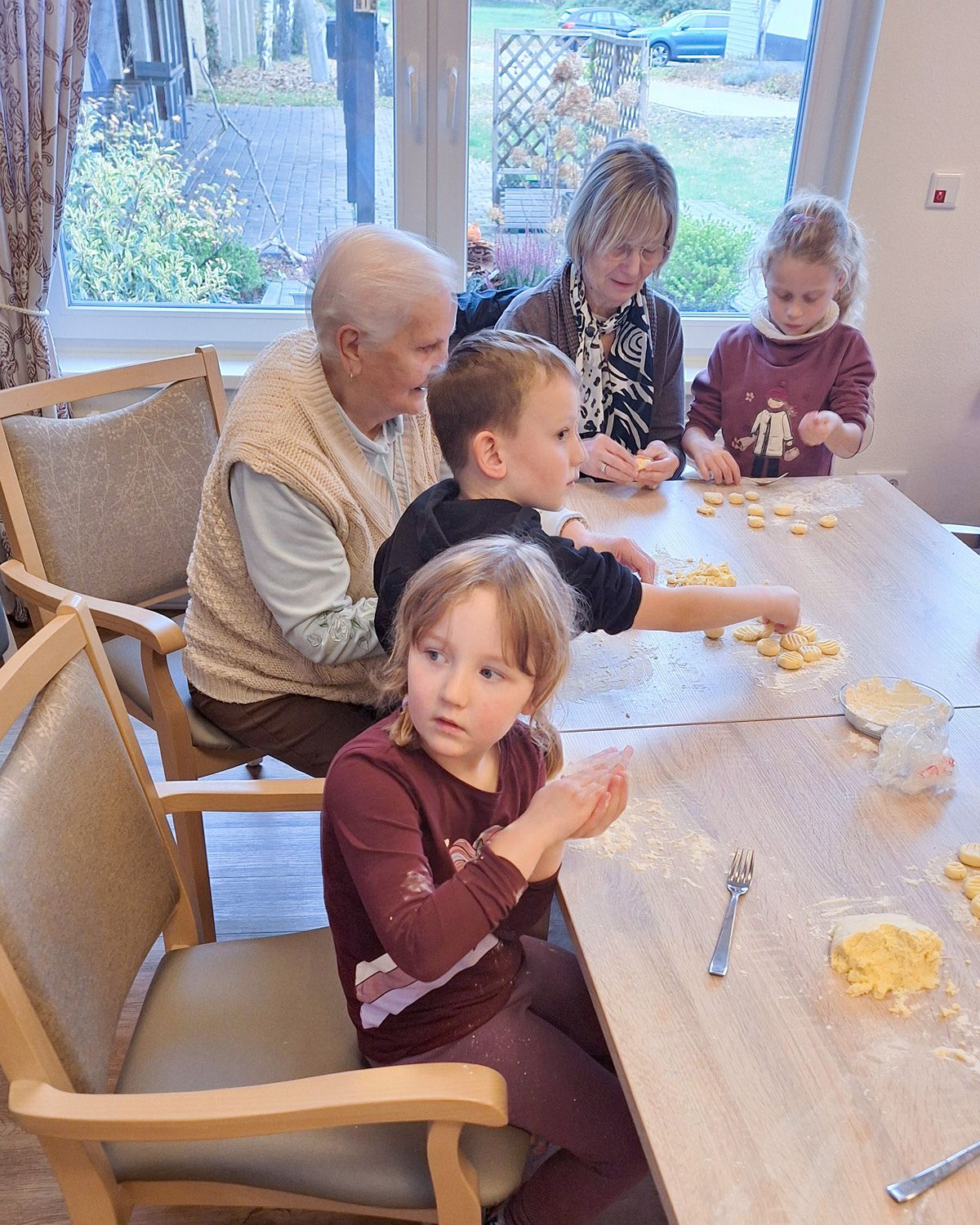 Ein ganz besonders emotionaler Moment entstand für Leni Wöstehoff, eine unserer Tagesgäste: Denn unter den Schülerinnen befand sich ihre eigene Urenkelin Leni. Die Freude war beiderseits groß, und die Oma strahlte über das ganze Gesicht. Schließlich erlebt man nicht jeden Tag, dass die eigene Enkelin in die Tagespflege kommt – und dann auch noch Plätzchen für die Oma backt!