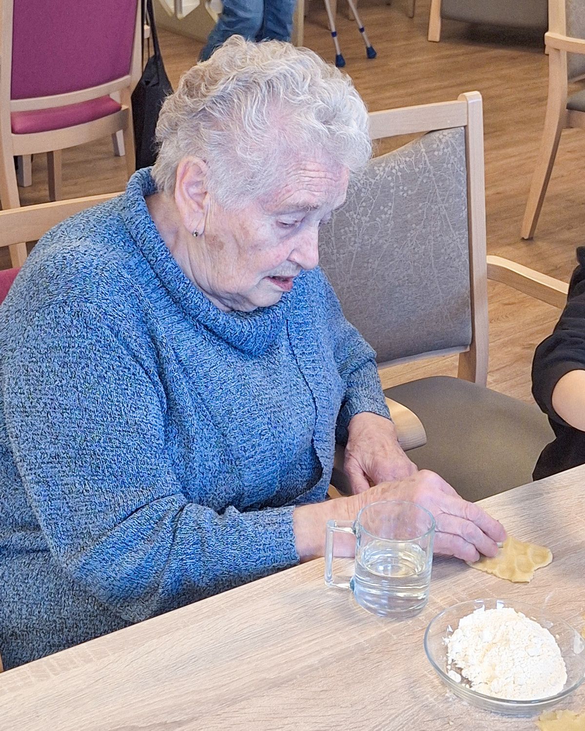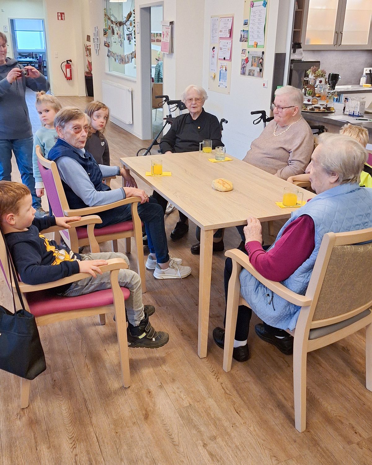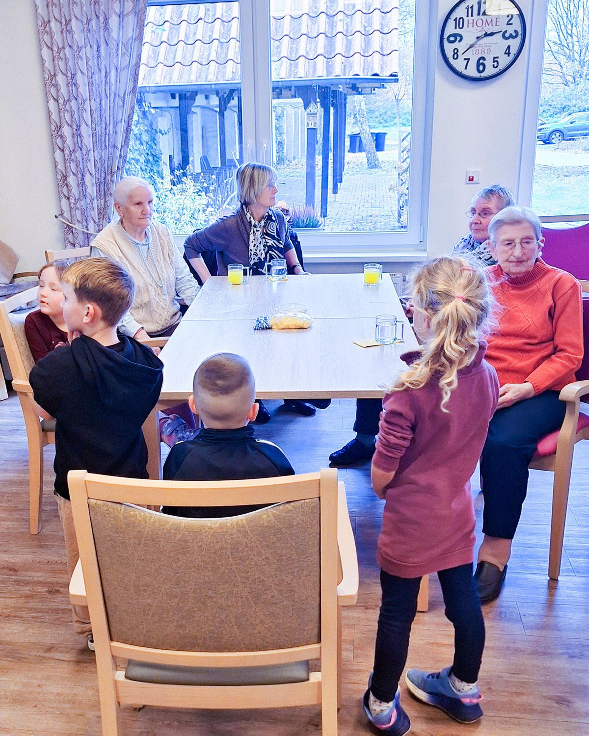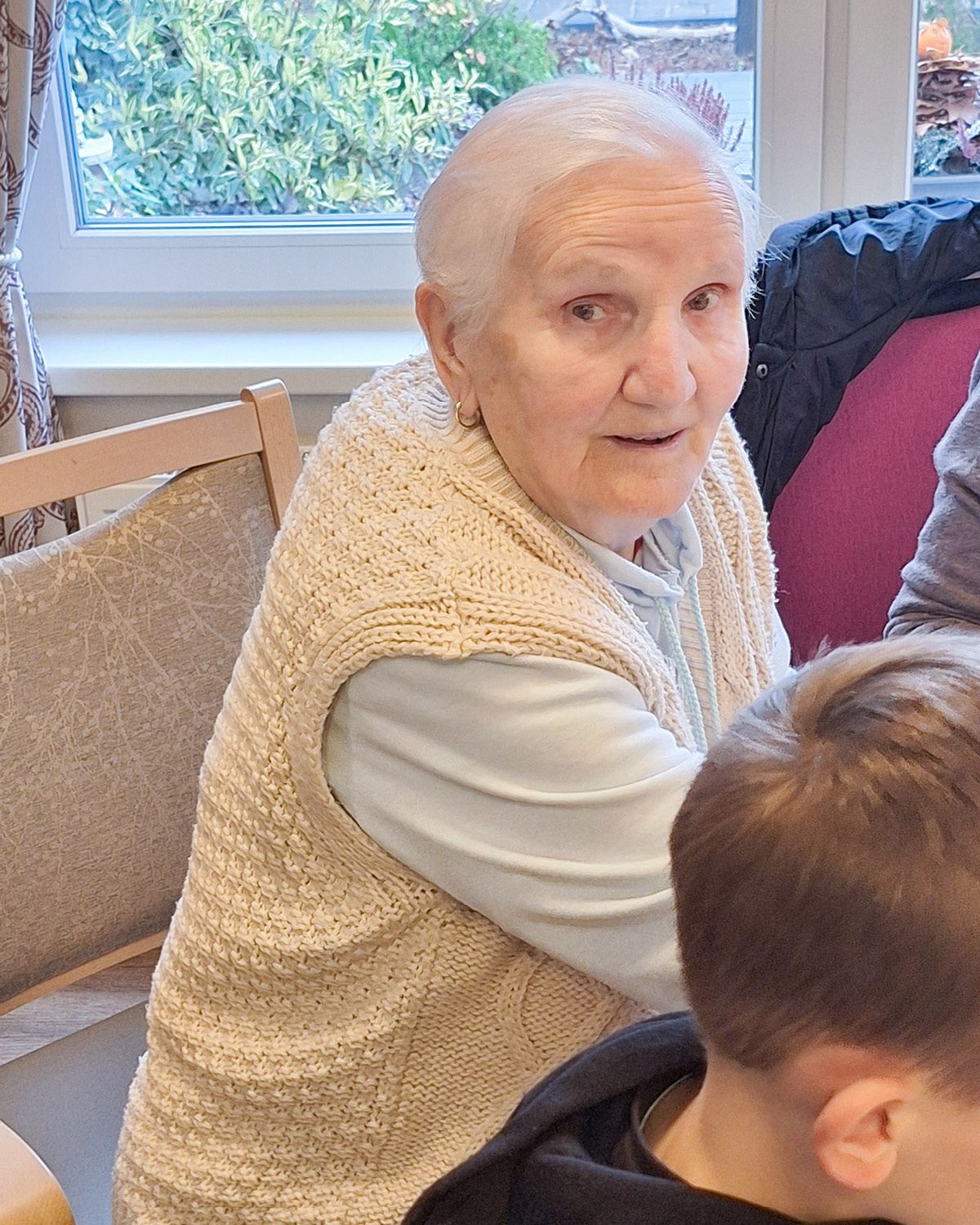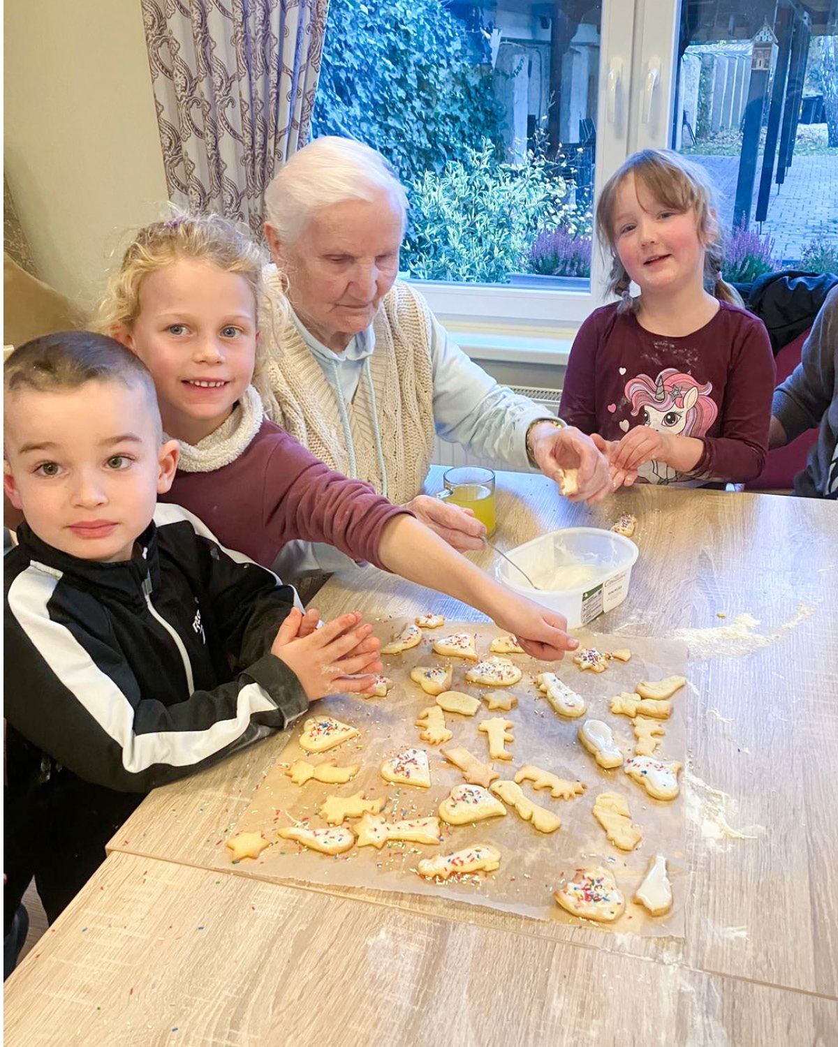 Ein ganz besonders emotionaler Moment entstand für Leni Wöstehoff, eine unserer Tagesgäste: Denn unter den Schülerinnen befand sich ihre eigene Urenkelin Leni. Die Freude war beiderseits groß, und die Oma strahlte über das ganze Gesicht. Schließlich erlebt man nicht jeden Tag, dass die eigene Enkelin in die Tagespflege kommt – und dann auch noch Plätzchen für die Oma backt!