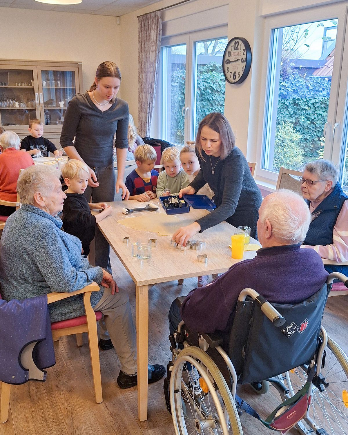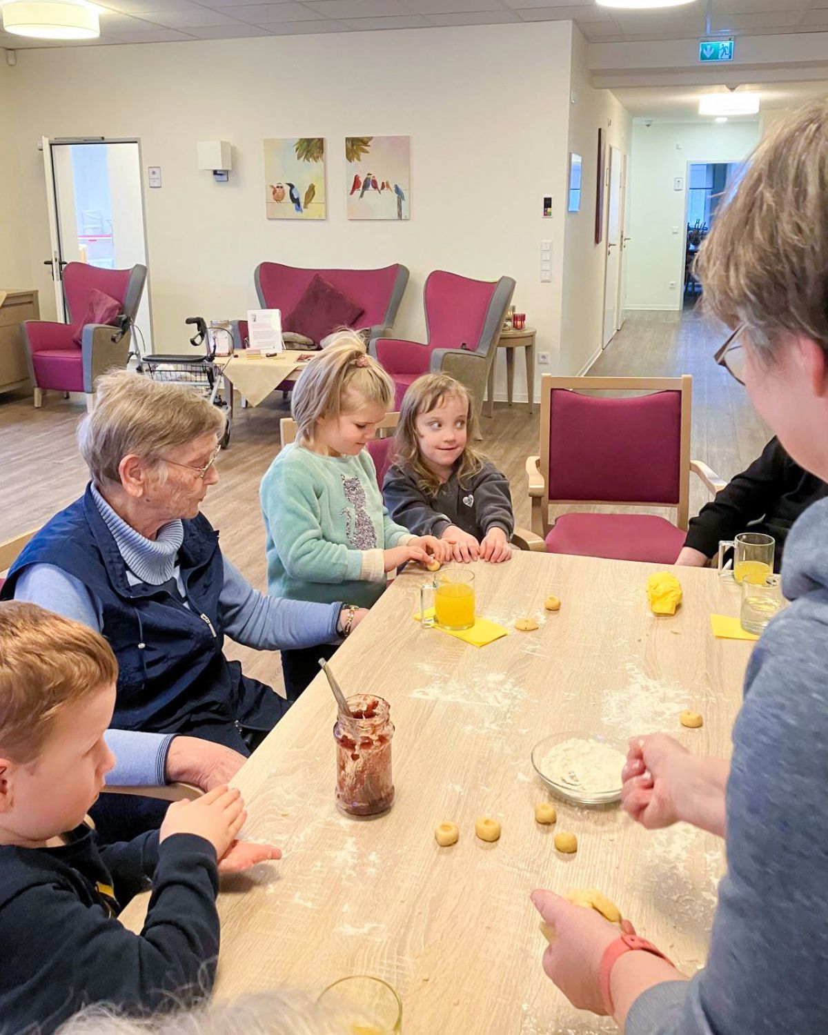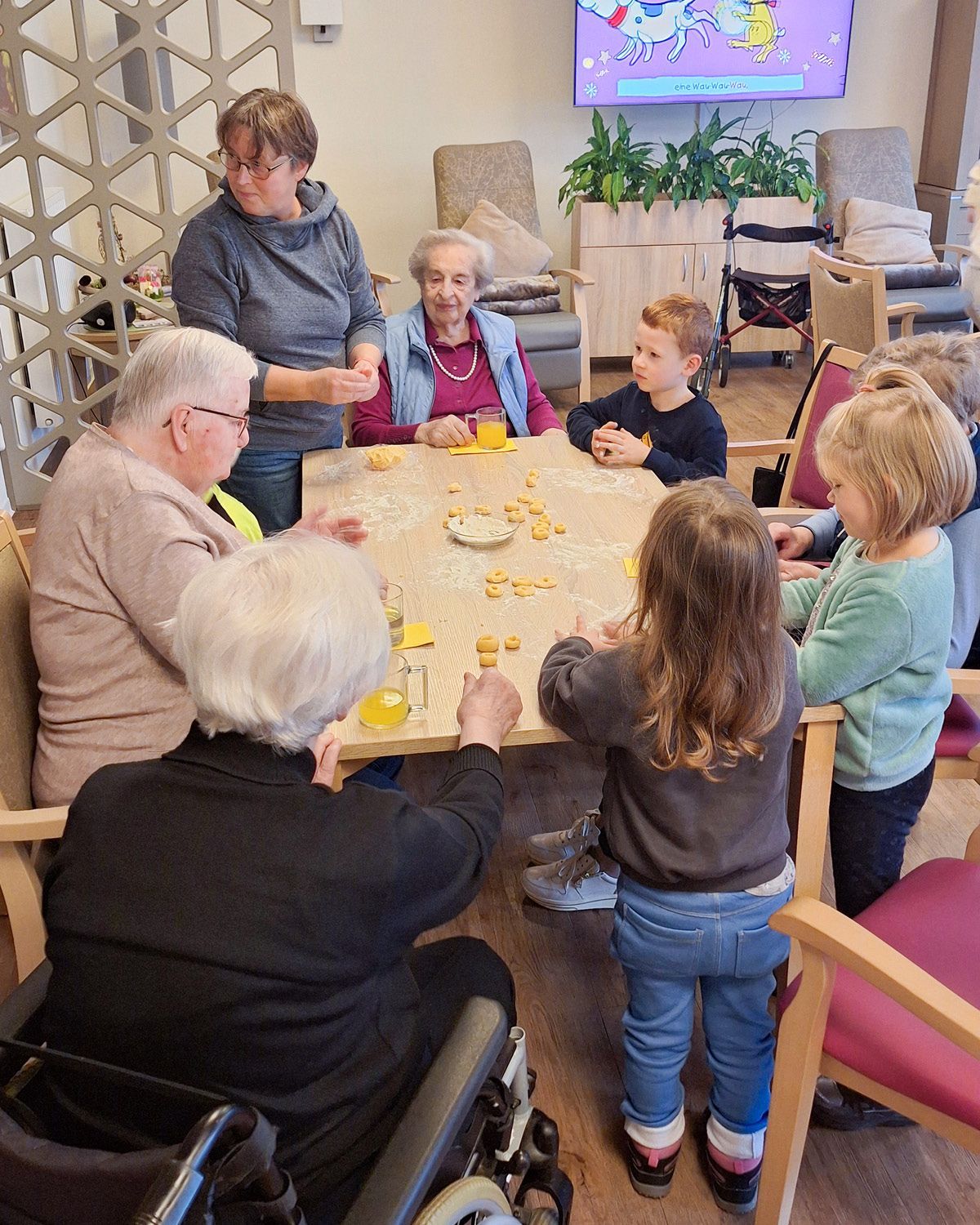 Damit das Projekt richtig lebendig wird, nahmen sie zusätzlich Kontakt zum Kindergarten Flohkiste auf. Gemeinsam mit den Vorschulkindern organisierten sie ein fröhliches und buntes Backprojekt bei uns im Haus. Von Anfang an herrschte eine herzliche und fröhliche Atmosphäre, denn die Mischung aus jung und alt sorgt einfach für besondere Momente.