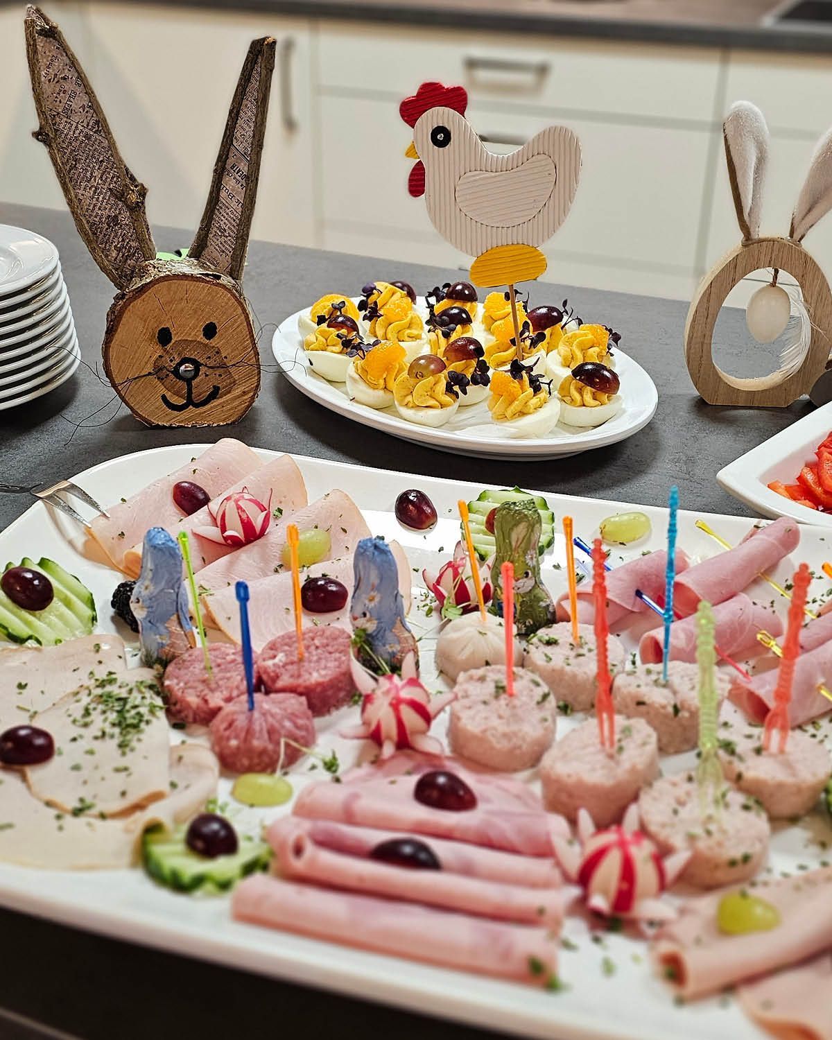 Heute starteten wir gemeinsam mit unseren Tagesgästen in einen ganz besonderen Vormittag – mit einem liebevoll angerichteten Frühstücksbuffet, bei dem es wirklich an nichts fehlte. Frische Brötchen, köstliche Wurst- und Käseplatten, Lachs und Forelle sowie selbstgemachter Frischkäse ließen keine Wünsche offen. Besonders unser bunter Obstteller mit Ananas, Apfelsinen, Mandarinen, Äpfeln, Weintrauben und Brombeeren war ein echter Hingucker.